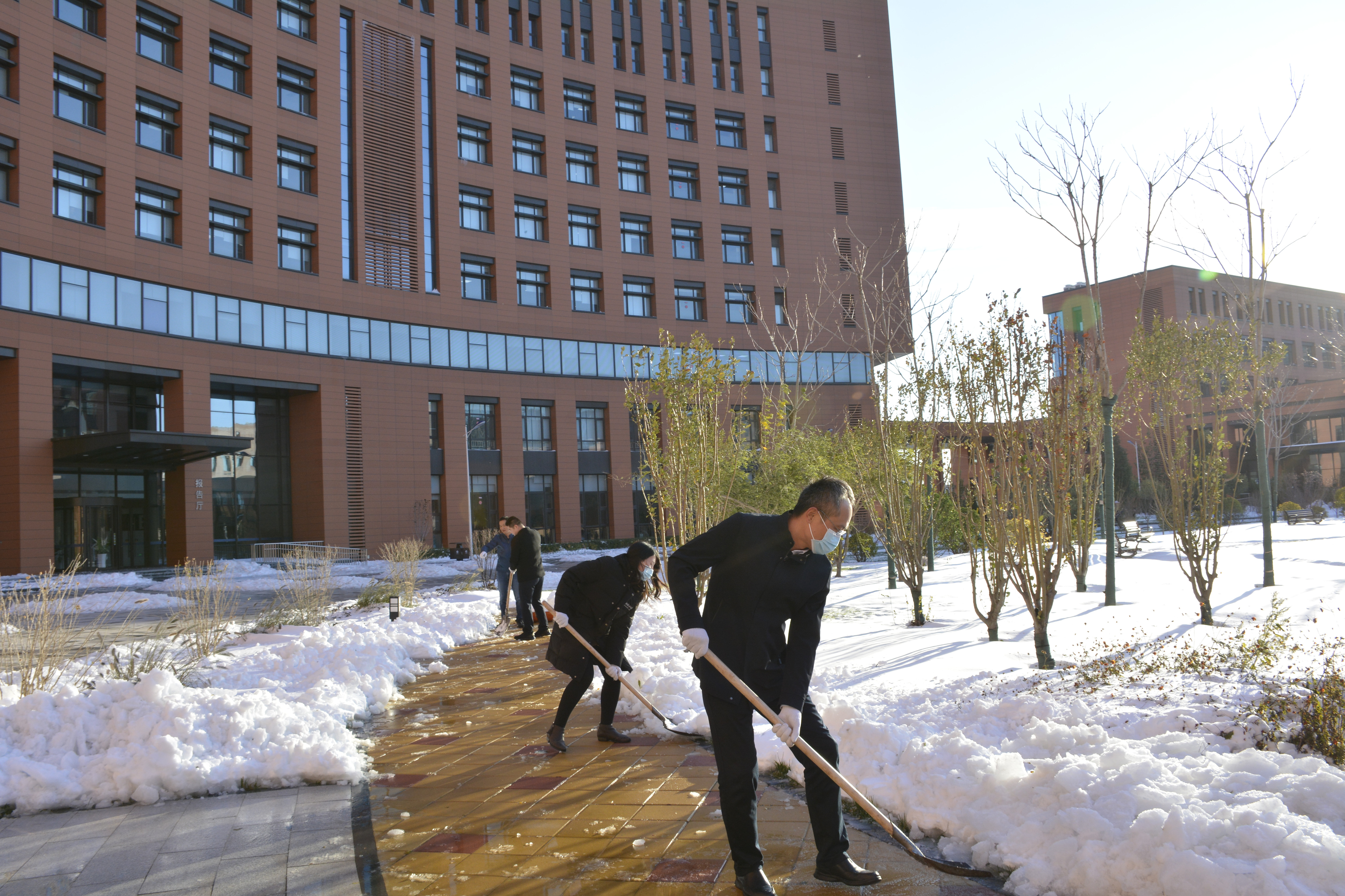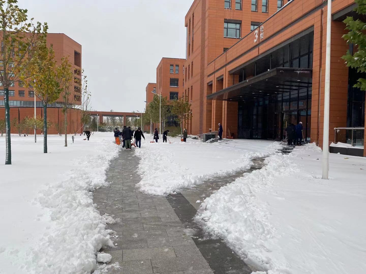 中心将此次极端天气应对工作作为深化党史学习教育,深入践行“我为群众办实事”的重要载体,第一时间向全体员工发出交通安全提示,实行灵活考勤制度,保证员工出行安全。严格各级值班值守,组织物业人员对园区排水管网、供暖配电设备进行全面检查,按需足量配备融雪剂、扫雪锹等物料物资,确保各项应急措施实施有效。中心党委书记、主任岳宗全充分发挥领导带头作用,带领中心各级党员干部、青年志愿者不畏严寒、积极奉献,深入园区庭院、积雪通道开展清雪行动,有效缓解了员工雪后出行、就餐的不便。